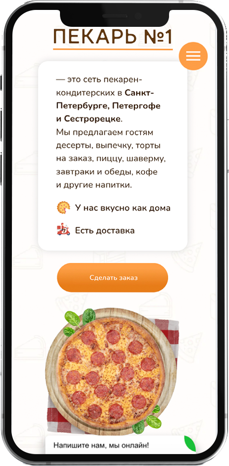 Task: a website for a chain of bakeries in St. Petersburg Pekar № 1 with the ability to place an online order and pay on the website for the following areas: pizza and pie delivery to events, cakes and desserts to order.